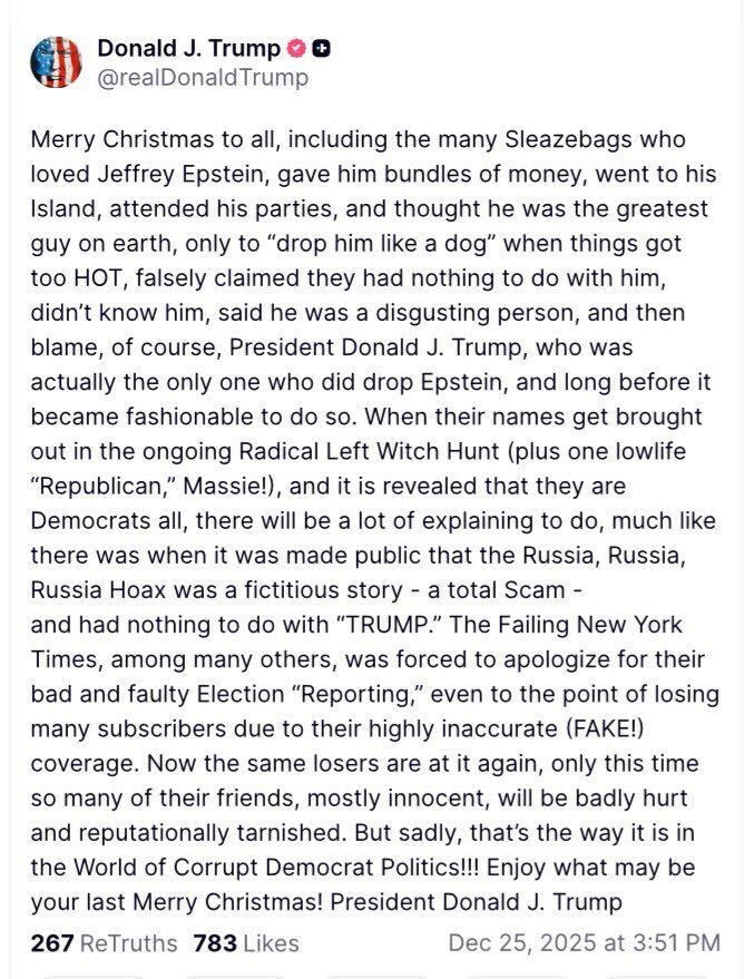 Morning all. Yesterday, on Christmas, our deranged leader posted close to 150 times on Truth Social. His manic posting included this one which:
