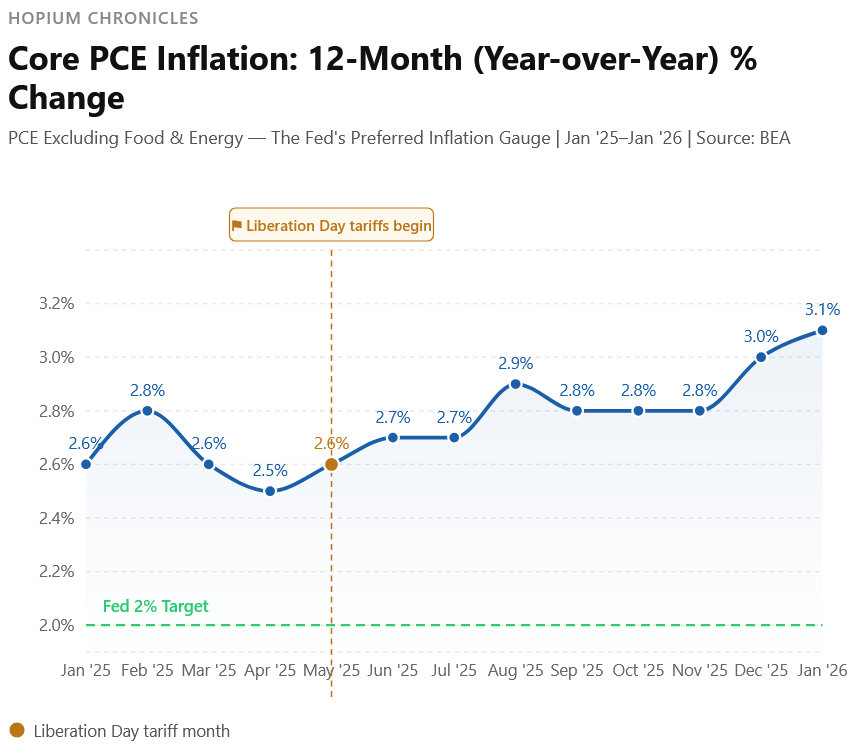 Morning all. We start the day with more evidence of how badly Trump’s economic program has failed us. The Fed’s preferred gauge of inflation, Personal Consumption Expenditures, came in hot again. The “core” result, minus food and energy, rose 0.4% in January, the second straight month of a 0.4% (5% annualized) gain. Over the last twelve months core PCE has risen 3.1%, more than 50% above the Fed’s target of 2%. With Claude’s help here’s the core PCE trendline. Note the increase since the tariffs were illegally levied: