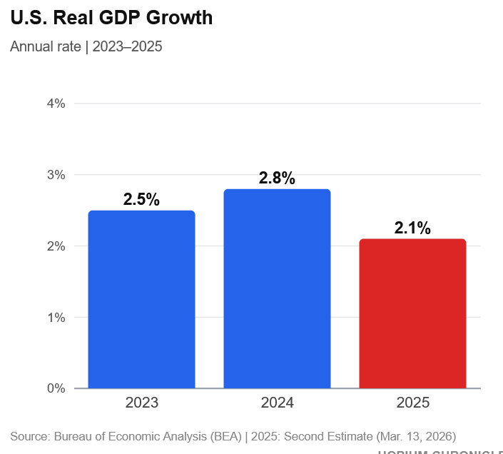 And we got a revised GDP number today showing that in that in q4 GDP growth was just 0.7%, down from an initial estimate of 1.4%. So not only are we seeing job loss, not gains, the economy barely grew at all in the fourth quarter, and came in much slower in 2025 than 2023 or 2024:
