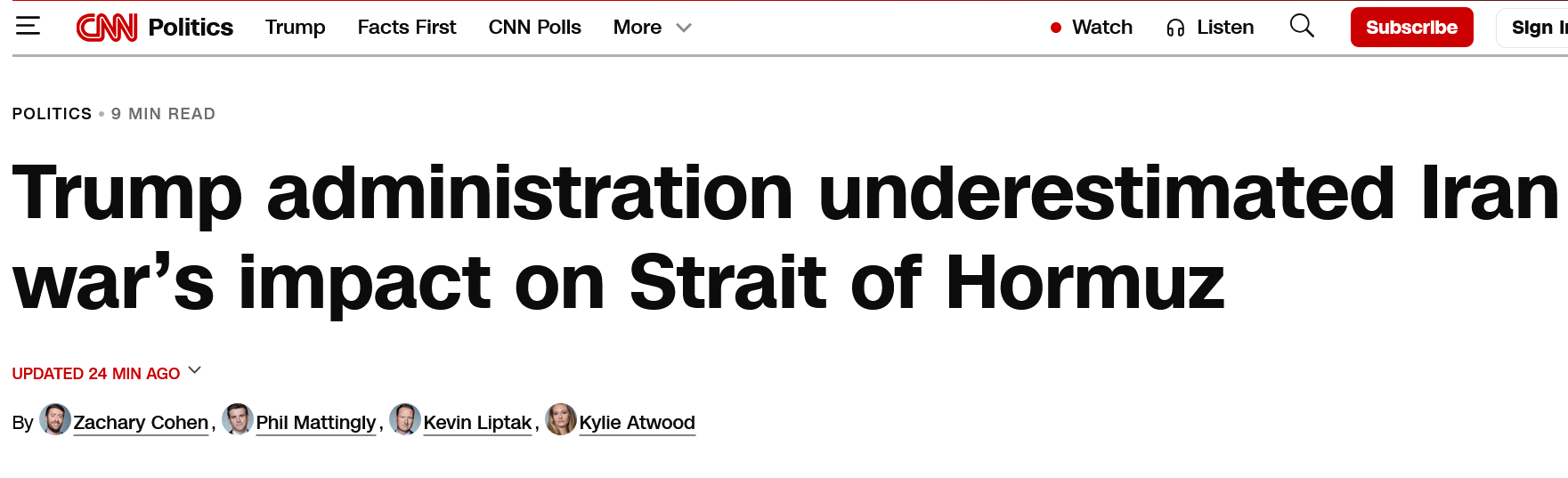 Again, all this data is from before the war. Trump went to war with an American economy slowing and inflation rising - and now we have soaring gas and other commodity (incl fertilizer) prices which will both drive prices higher and further slow an economy already teetering on recession. A new CNN report helps explain why the Trump regime was willing to take this extraordinary risk with our economy and our economic lives - they didn’t think Iran would close the Strait of Hormuz. Okey-Dokey!