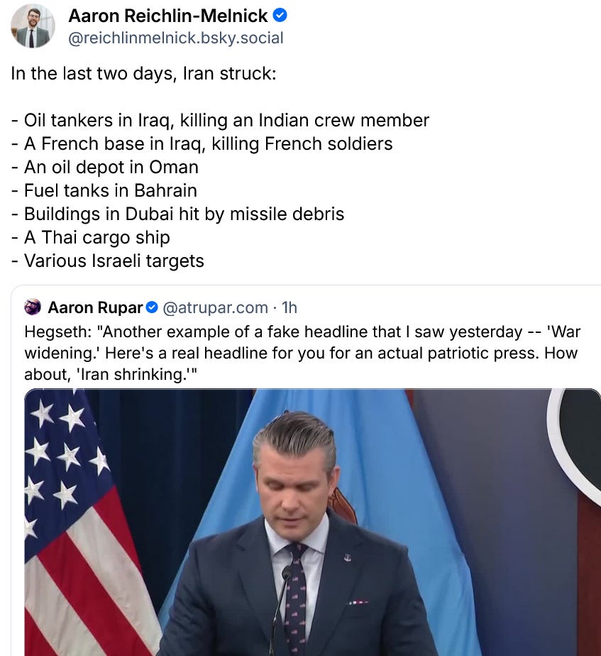 Yesterday, in his press conference, Hegseth said "The only thing prohibiting transit in the straits right now is Iran shooting at shipping. It is open for transit should Iran not do that."