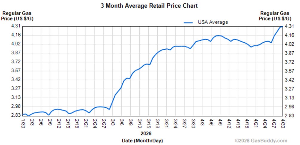 Oil prices continue to bounce around all time highs for the war as it becomes clear to all that Trump has no way of ending the war and opening the Strait. Gas prices in the US have surged to their highest of the war: