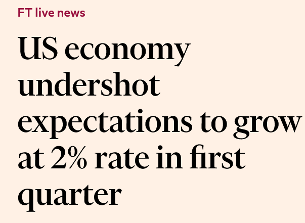 Now, the economic news. The bottom line - q1 GDP growth came in lower and the PCE inflation measure higher than expected. First quarter GDP growth was 2%, lower than the consensus 2.2%. PCE for the month came in at 0.7, higher than the Cleveland Fed Nowcast of 0.58. “Core” PCE also came in higher than the Fed Nowcast. What this means in simple English is that the economy was slower in the first quarter and inflation higher in March than was expected. Great work Donald.