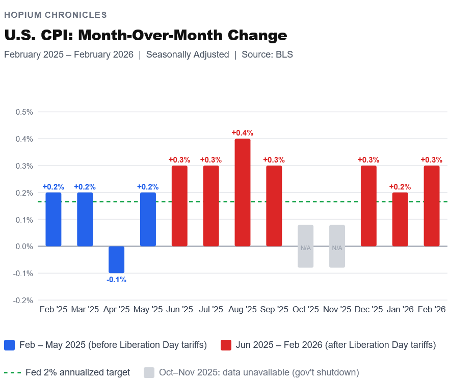 Here’s a chart I threw together with Claude this morning showing how in the months prior to the May Liberation Day tariffs inflation was at the Fed’s target rate. Since May CPI has increased by an average of 0.3%, or 3.6% on annualized basis - again, way above the Fed target.