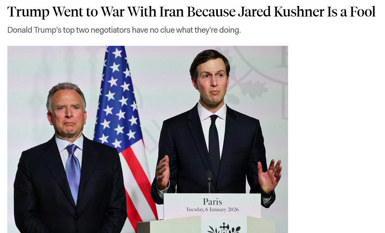 In our discussion a few weeks ago Dr. Phillips O’Brien called Witkoff and Kushner the Laurel and Hardy of global diplomacy. But what they are doing - the incomprehensibly corrupt “Board of Peace” and occupation of Gaza; the appeasement of Putin, and siding with Russia against Ukraine; the ignorant counsel to launch this reckless war; the outrageous invasion of Venezuela and stealing of their oil - cannot be tolerated any more. They must go. Them leaving government, and forcing Trump to let the diplomats and national security experts do their thing, has to become part of our agenda now.