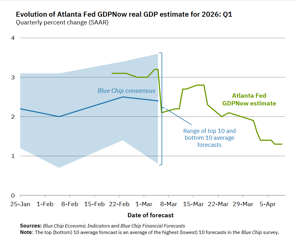The Atlanta Fed’s GDPNow projections show q1 2026 GDP growth cratering since the war began from 3.2% to 1.3%:
