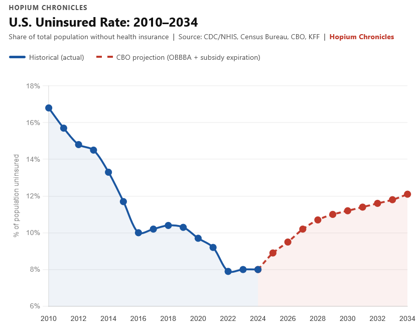 The economic and societal effects of Trump’s savage assault on research, public health, and science are only just beginning to be felt. Here’s a conservative estimate of the impact of Trump’s health care cuts on piece of what is coming, the uninsured rate. Years of progress heartlessly undone, on purpose, to pay for tax cuts for Trump, his friends, and his donors: