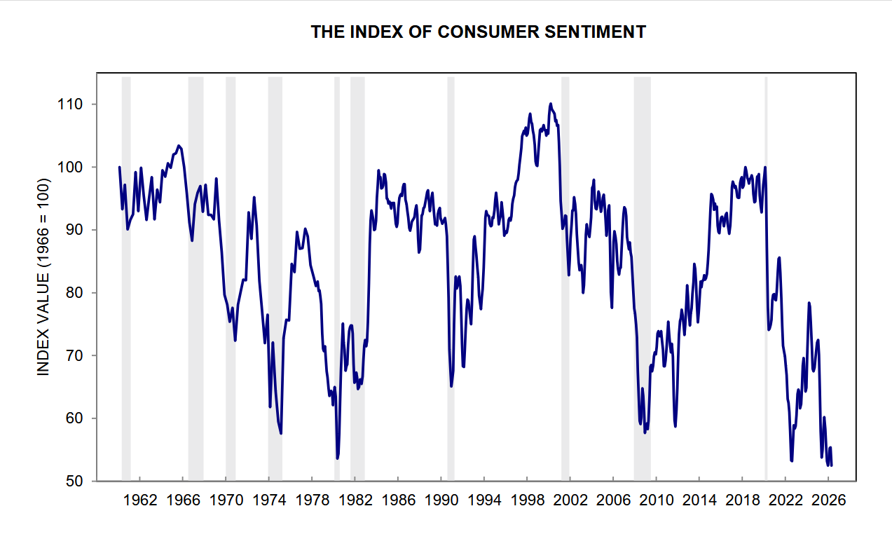 This morning’s University of Michigan consumer sentiment survey reported it’s lowest reading in the history of the survey, going back 65 years. Here is a chart with a slightly different way of reading the data, showing it now at its lowest level ever. Trump is a titanic fuck up: