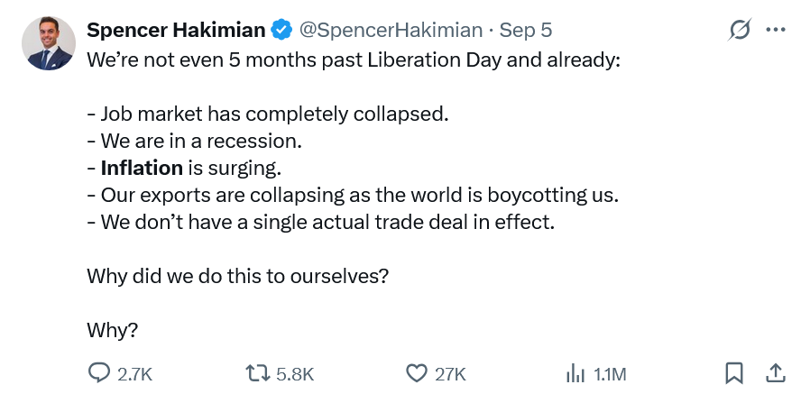 A reminder that in early August Trump raised tariff rates significantly on most goods coming into the US. In some cases he raised the rate five fold. And prices surged in August. As we’ve been saying here it has become impossible to ignore the clear, manifest failure of Trump’s economic plan, and Democrats are right to be making rolling back these terrible tariffs central to our fall strategy.