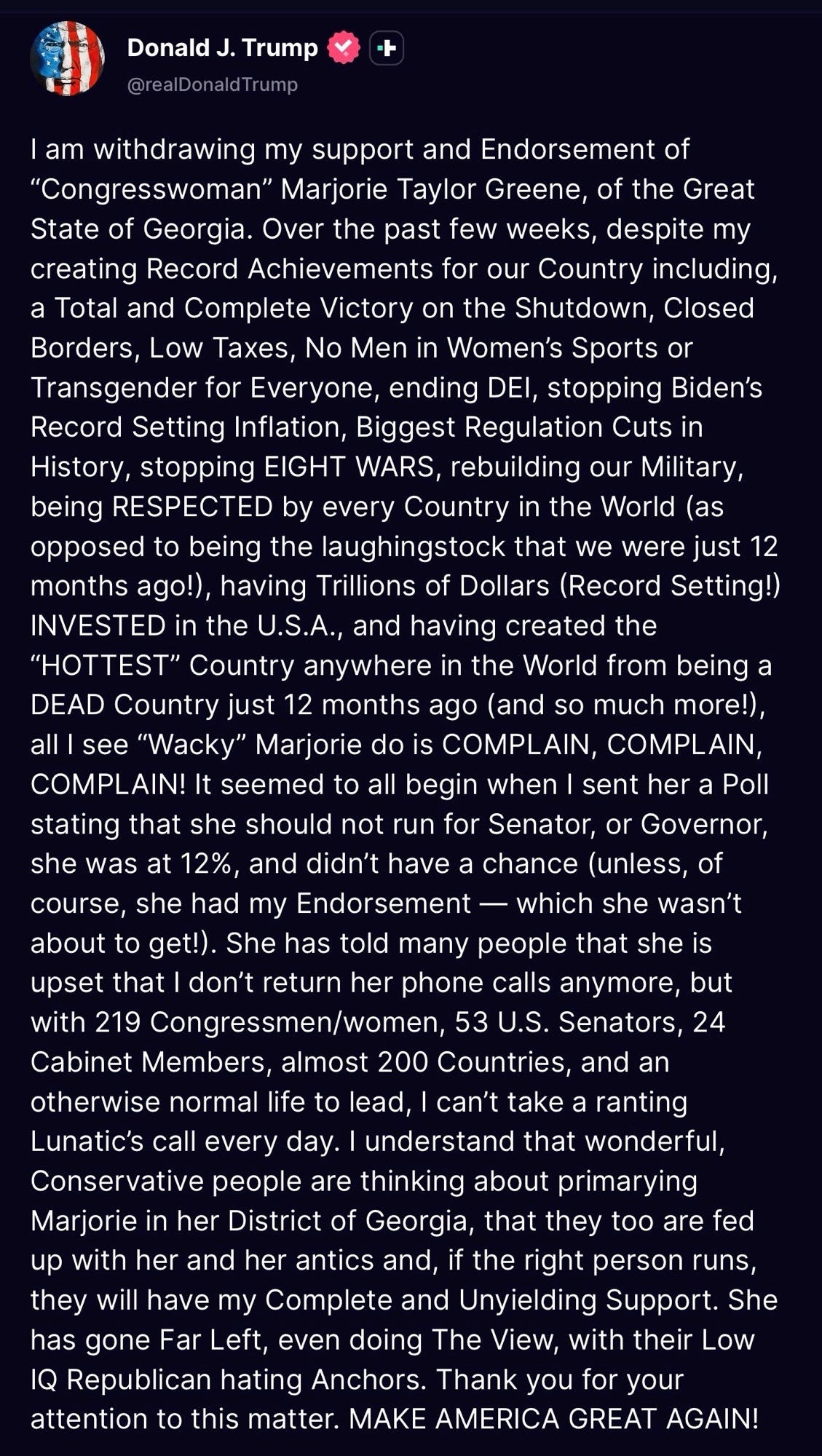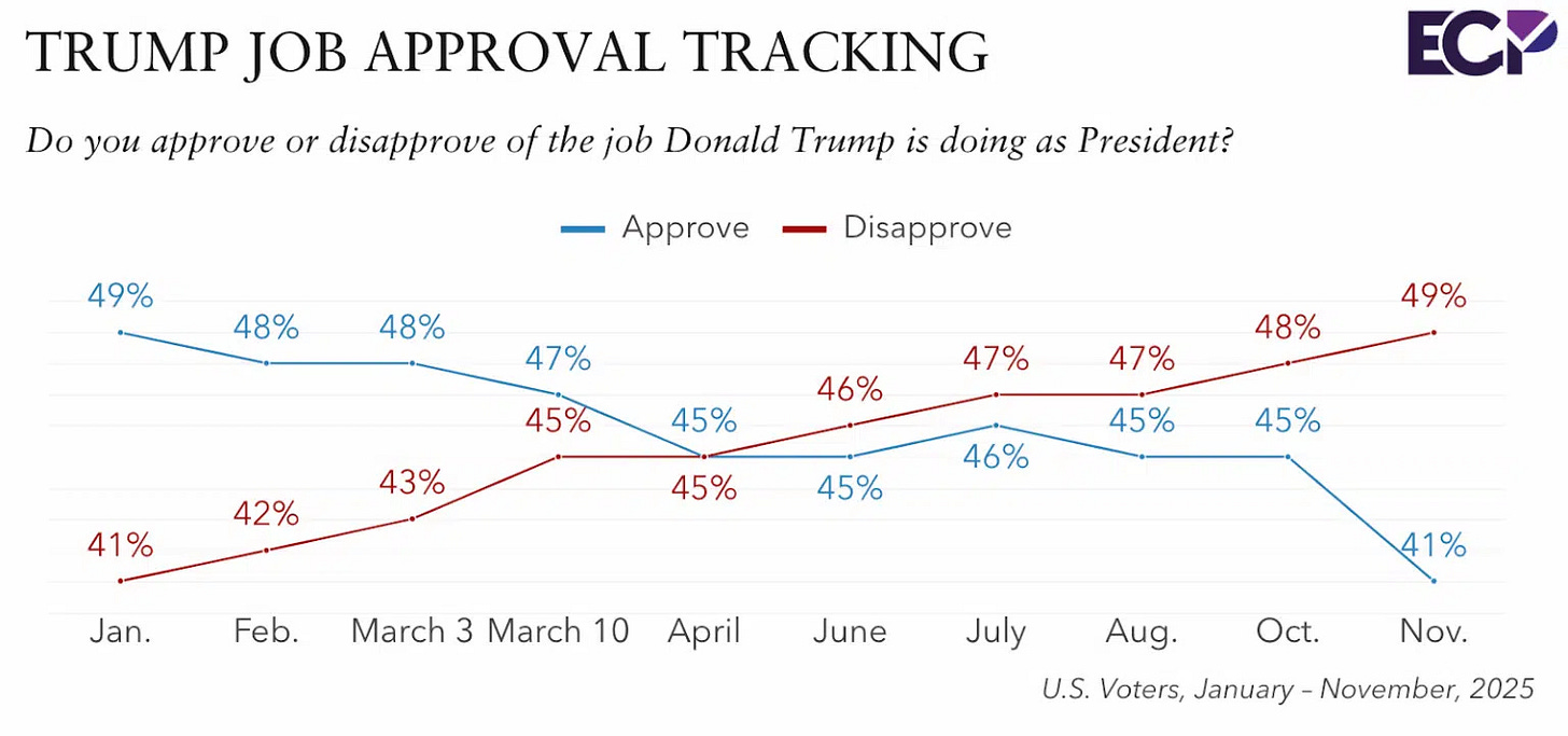 Trump now sits at extraordinary levels of unpopularity, at or even lower than where Biden was when he was forced from the Presidential race last summer. His failed agenda is even more unpopular than he is. His party just got blown out - by enormous margins - all across the country in the 2025 elections. His Senate just voted to repeal his terrible tariffs. His big gambit to steal Congressional seats has backfired. His imperial and destructive management of the shutdown did enormous damage to him and the party brand. One of his most loyal and well known supporters, Marjorie Taylor Greene, has publicly and very aggressively broken from him. House Republicans just joined with the Democrats to pass a discharge petition to release the Epstein files, overcoming furious lobbying from him and his government. His government wide coverup of the Epstein trafficking ring has become an historical scandal. Next week the House will vote overwhelmingly to release the full Epstein files in what will be an extraordinary and in your face rebuke of Trump not just as President but as a man. This vote is not just defying the President of the United States, it is defying Trump himself, his brand, everything about him.