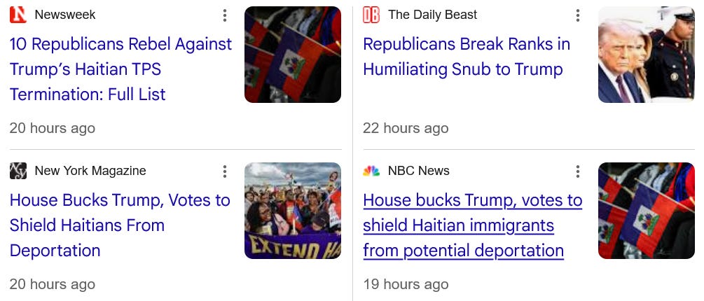 Where the greatest evidence of the decay and weakening of the regime can now be found is in the extraordinary level of disarray and dysfunction on the Hill. Yesterday, in a dramatic rebuke of Trump on his signature issue, 10 House Rs joined with Democrats to extend Temporary Protected Status (TPS) for Haitians now in the US.