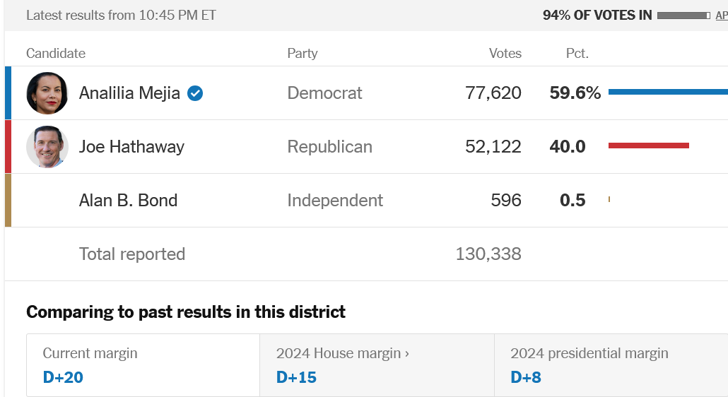 Democrats continue to dramatically outperform their 2024 election results in races of all kinds all across the country. Last night it was Jessica Mejia in the special election in NJ-11 to replace Mikie Sherrill: