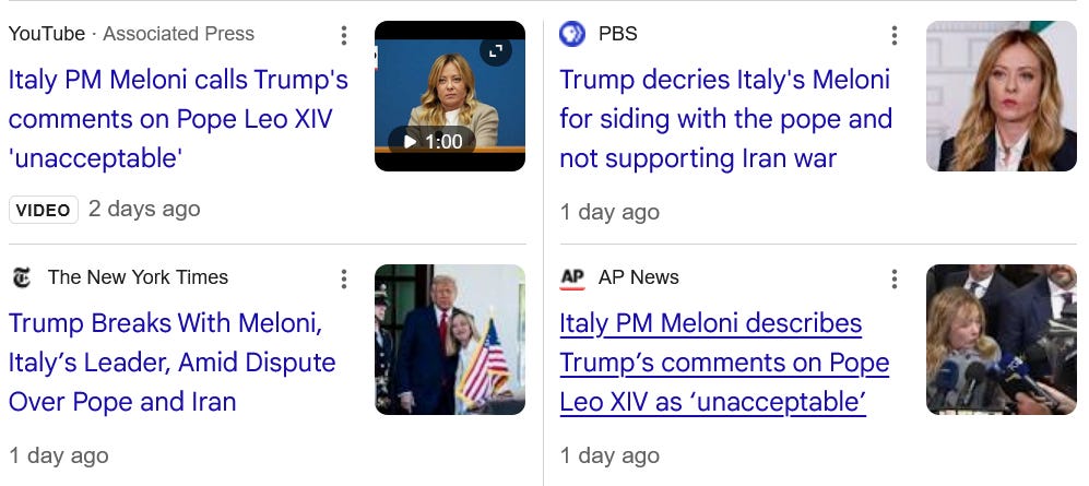 The simplest way to explain what is happening here is that MAGA has failed, Republicans have begun waking up to the governing and electoral disaster Trump has created for them, and furious, desperate, clumsy efforts are now underway to course correct, distance, find a new path from the catastrophe of MAGA/Project 2025/Trumpism. To use Hopium language Republicans are growing increasingly weary of defending the indefensible, and with seven months before the election - a life time - they were always unlikely to accept becoming Thelma and Louise. There are limits to loyalty when political careers and party power are on the line - as Joe Biden discovered in 2024 - and in this case when the failure is so clear, and his public behavior - attacking the Pope, repeated blasphemies - has become so outrageous and ridiculous. In recent days even one of Trump’s most staunch defenders in Europe, Italian Prime Minister, Giorgia Meloni, has broken with him, and he with her: