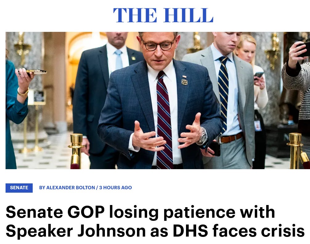 Then last night, Mike Johnson in another rebuke of Trump, was unable to stop a House GOP rebellion against Trump’s warrantless FISA bill. Here’s Punchbowl’s reporting, The FISA flop, plus Republicans can’t stop fighting each other. Please read every word of this. It’s astonishing:
