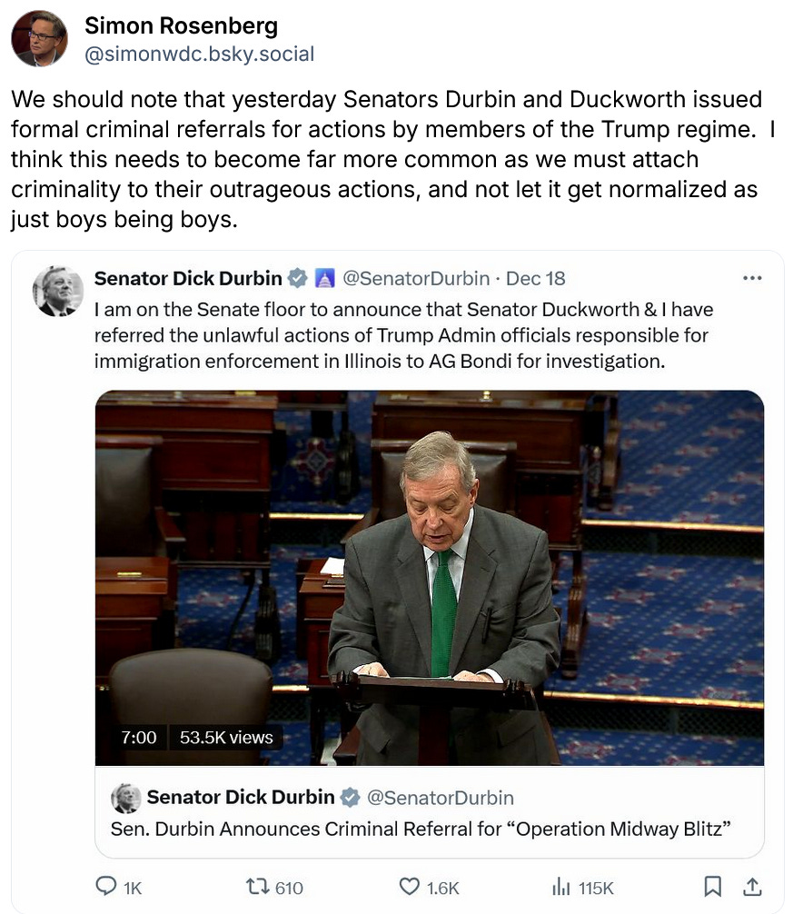 On Thursday Senators Durbin and Duckworth sent criminal referrals to the Department of Justice for the illegal actions of DHS/ICE agents in Chicago.