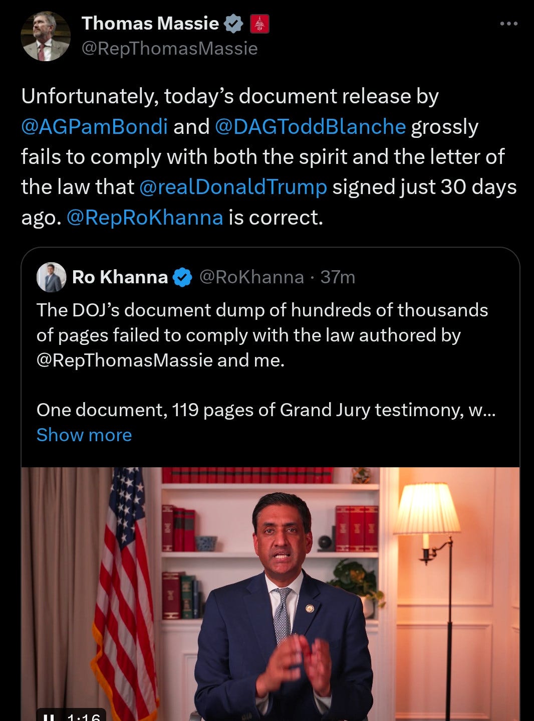 Morning all. Yesterday Trump and Bondi released less than 1% of the Epstein files despite a clear legal requirement to release everything by midnight last night. They’ve redacted entire documents and covered the faces not of victims, but of the men who committed the crimes. It’s a brazen and shocking f-ck you to the survivors, to Congress, to the American people. It’s also illegal, wildly illegal.