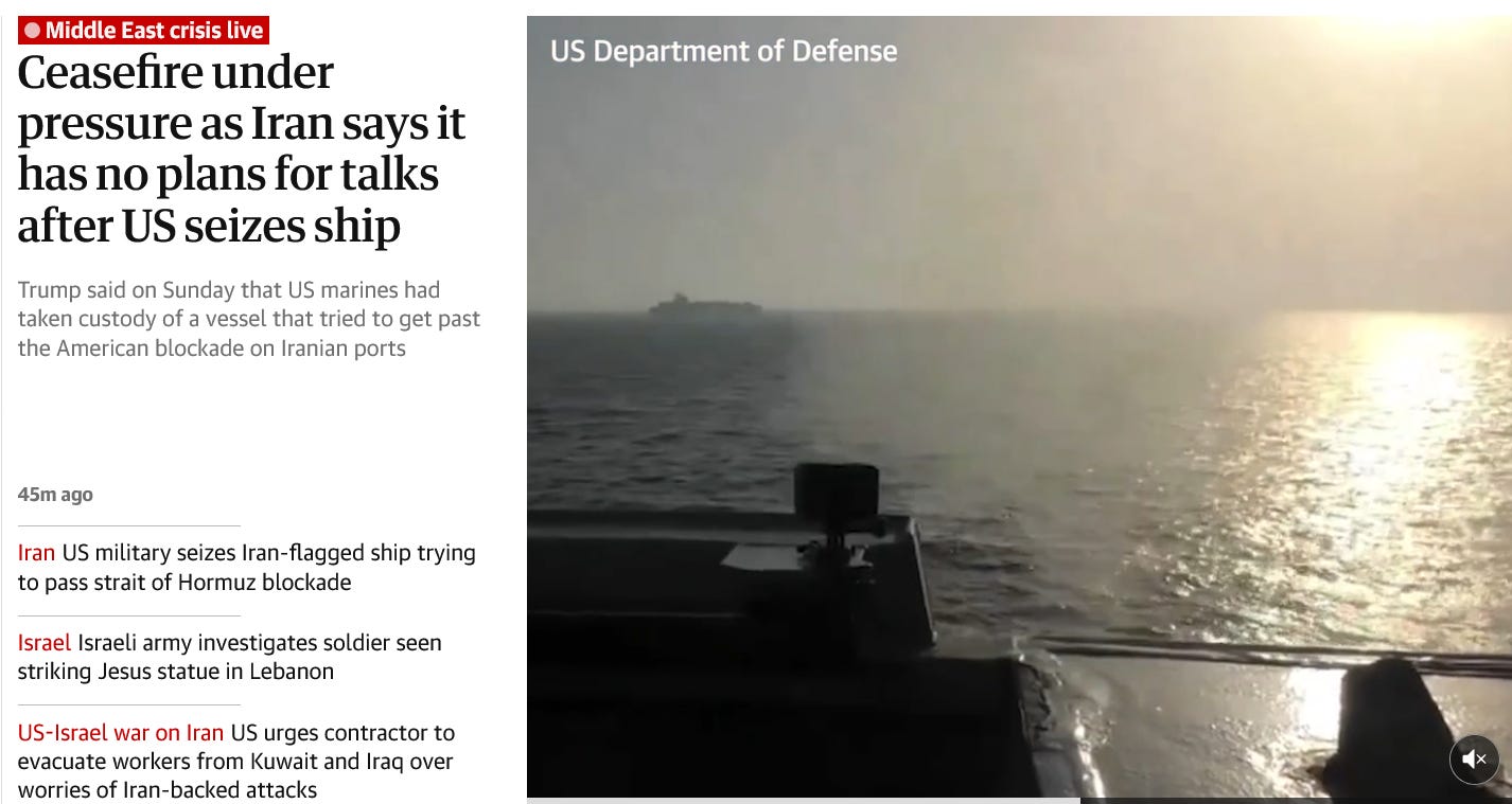 Trump has lead America and the world into a grave, historic crisis, one which given our leader’s madness, no longer has an easy resolution - as we’ve seen in the news this morning. Iran isn’t even participating in the talks Trump announced, and the Strait of Hormuz remains closed, because our military do not honor the cease fire, blocking Iranian ports and now seizing an Iranian cargo ship: