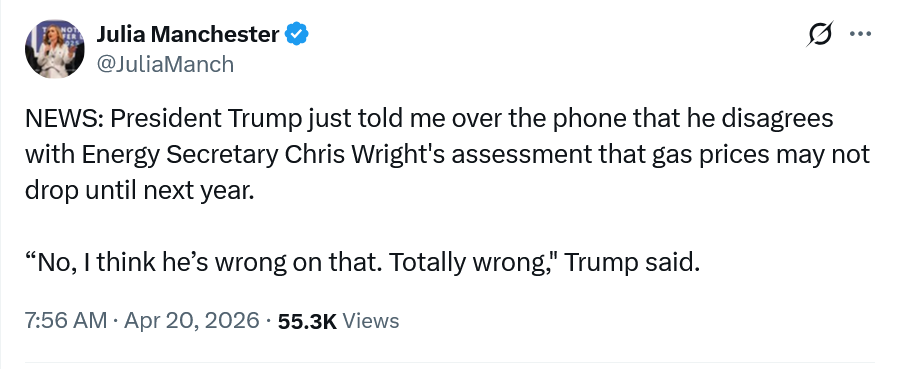 This was no slip of the tongue. Last week, Wright told Semafor prices will remain “high and maybe even rising” until “meaningful ship traffic” returns to the Strait of Hormuz. Trump told Maria Bartiromo on Fox News last Sunday that gas prices could be “around the same” or “maybe a little bit higher” when we hit election season this fall.