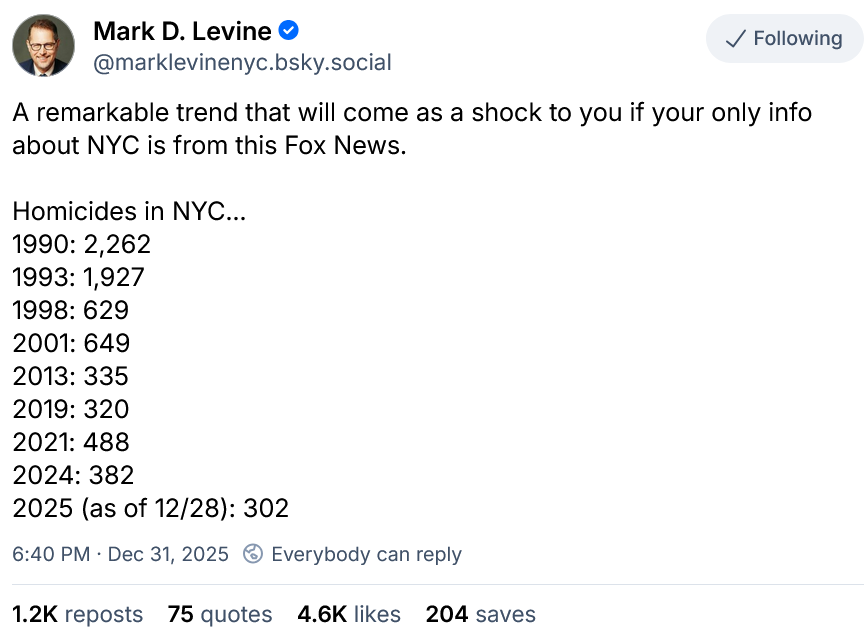New York City Comptroller Mark Levine posted this reminder on Bluesky a few days ago. As we’ve often discussed here Democrats should be taking far more credit for having brought down violent crimes of all kinds over the past generation, everywhere. America is much safer today: