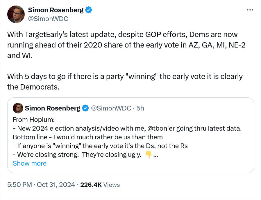 Our last Founding Members home stretch Friday before the election is today at 1pm ET. 4 days out everyone! Try to watch my new video and analysis about the election to prep. As I wrote this morning, with all the data from the last few days it is clear we are heading into the final weekend with momentum, a better candidate and a far superior campaign. All of this is why I believe we remain favored to win.