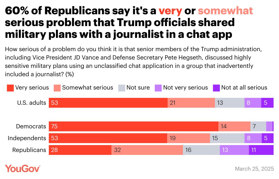 Hegseth, Gabbard Must Go - We got our first poll on Signalgate (Treasongate, Idiotgate, Dipshitgate) and it suggests that this fiasco has already become a very serious political problem for a President whose poll numbers have already taken a big hit. Note that the question asked is about as charitable to Trump’s team as one could craft, and that, already, a majority of Republican voters think it’s a serious problem: