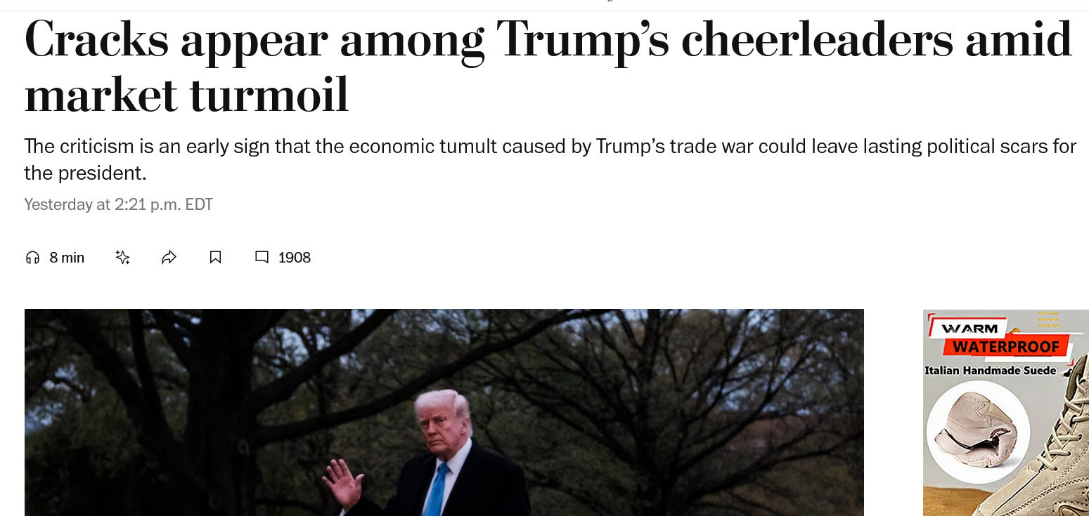 This growing and undeniable sense of his weakness, his madness, his recklessness, his gross incompetence and his idiocy is causing little cracks to become bigger cracks here in Washington. I hope all Hopium regulars enjoy this headline from the Washington Post this morning: