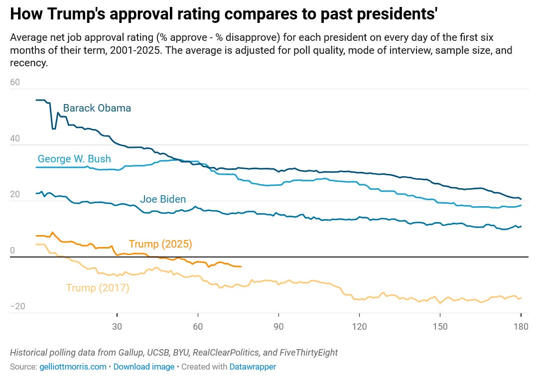 A reminder of where Trump stands today versus other recent Presidents, via G Elliot Morris’ Strength In Numbers Substack.