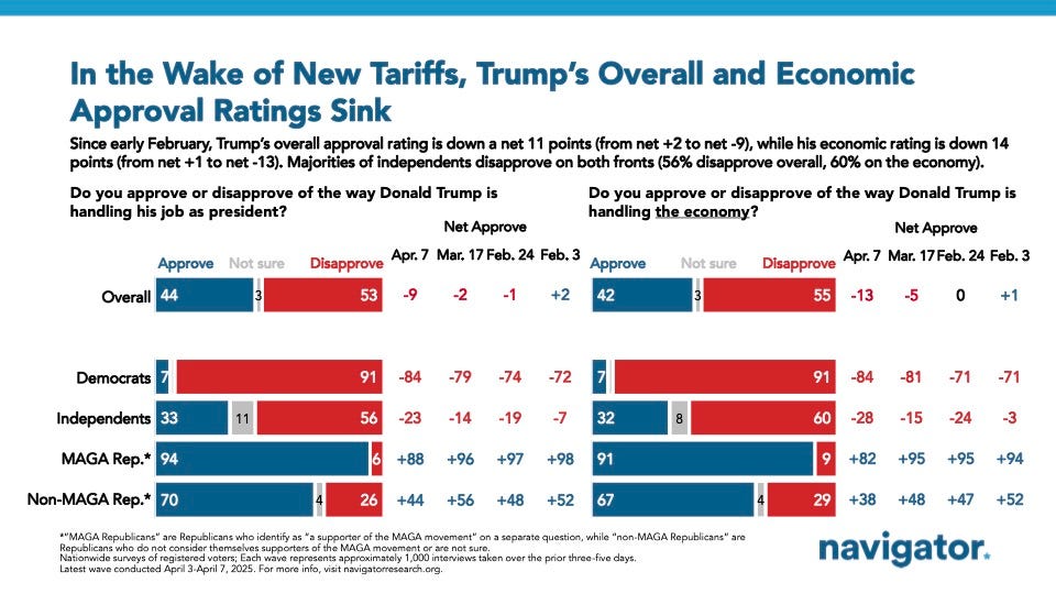 Trump is weaker today than when he took office. It’s a central reason why we’ve been overperforming in special elections across the country this year and blew it out in Wisconsin last week. Depending on the poll between 3 and 7 percent of the overall electorate voted for him and now disapprove of the job he is doing. In these three polls his disapproval rating is 52%-53% which is very high. When Biden dropped out of the race last summer it was bouncing between 54%-56%.