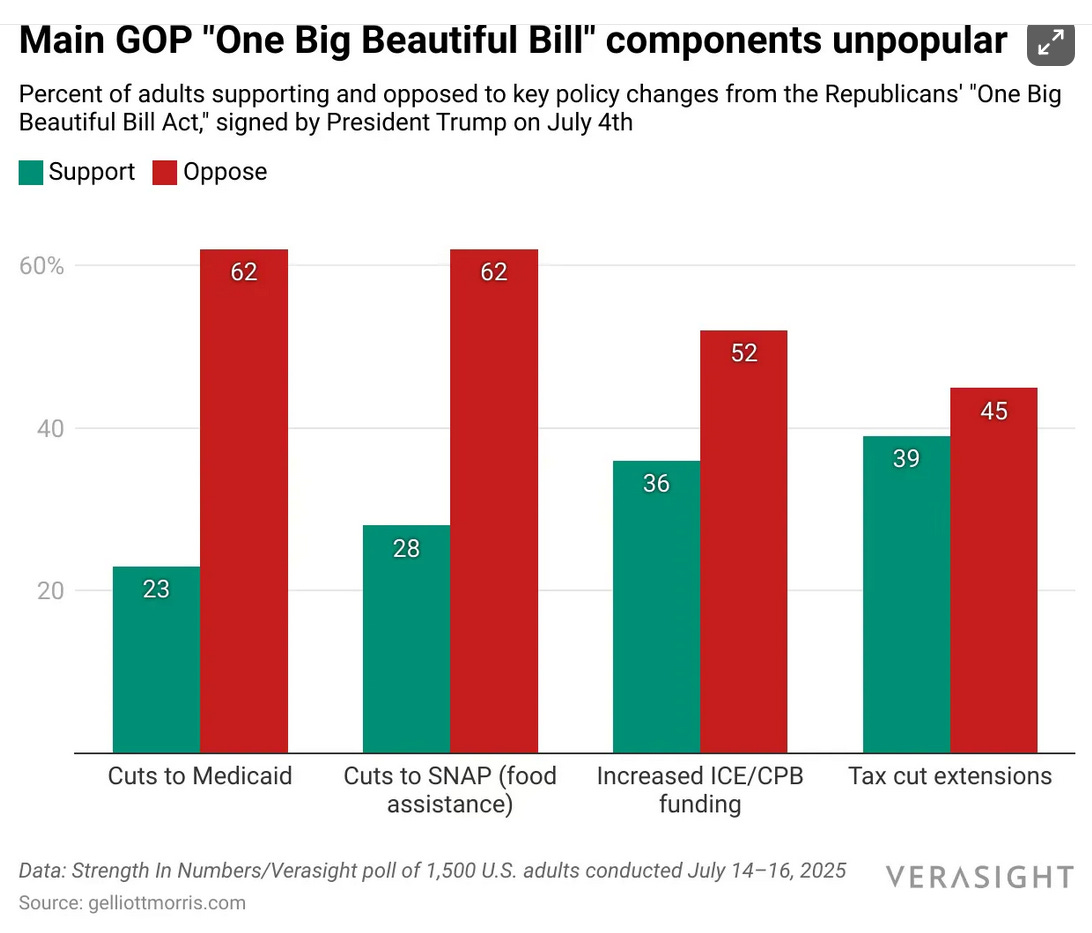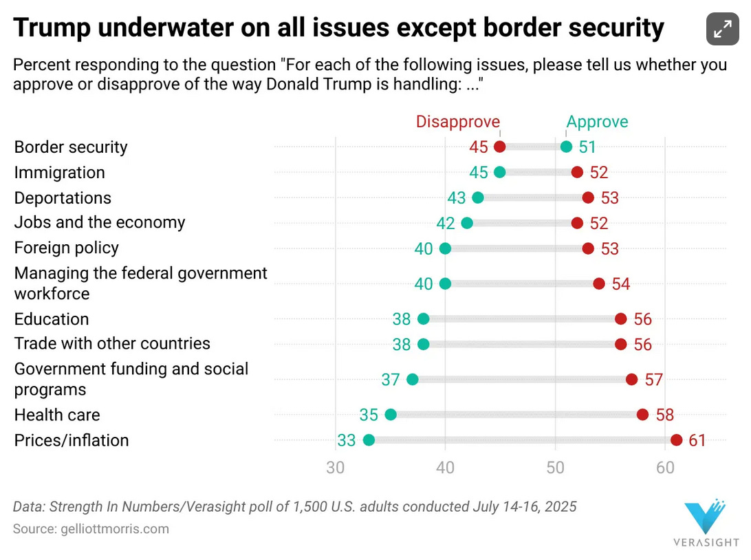 The question in front of all of us now is what is Trump going to do to try to improve his standing? What does he do over next few months? What I see now looks far more like peril than promise for his flagging political project, as he has three potentially deeply damaging events hurtling at him: 1) The escalating Epstein scandal 2) his August 1st tariff escalation 3) the passage of his fiscal year 2026 budget which is going to be loaded with incredibly unpopular things from onerous tariffs to ICE escalation to cuts to NIH to exploding deficits to the end of this year’s ACA subsidy cuts.