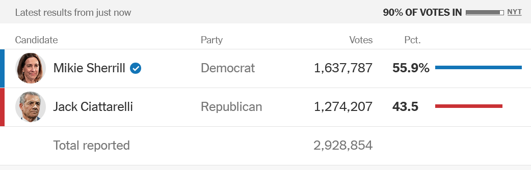 Mikie Sherrill is up by 12+ points right now. All those red wave pollsters that corruptly tried to show the race close these last few weeks can just f-ck all the way off.