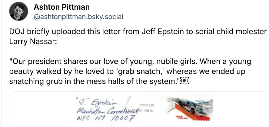 First up is a recording of a conversation I had with Dem strategist Mike Nellis yesterday. Video and transcript are above. We got to dive into all the big topics of the moment - my optimism about 2026, Trump’s unprecedented corruption, the Bari Weiss fiasco, the need for the DNC to release its look back at the 2024 election, and more. Get to it when you can…….