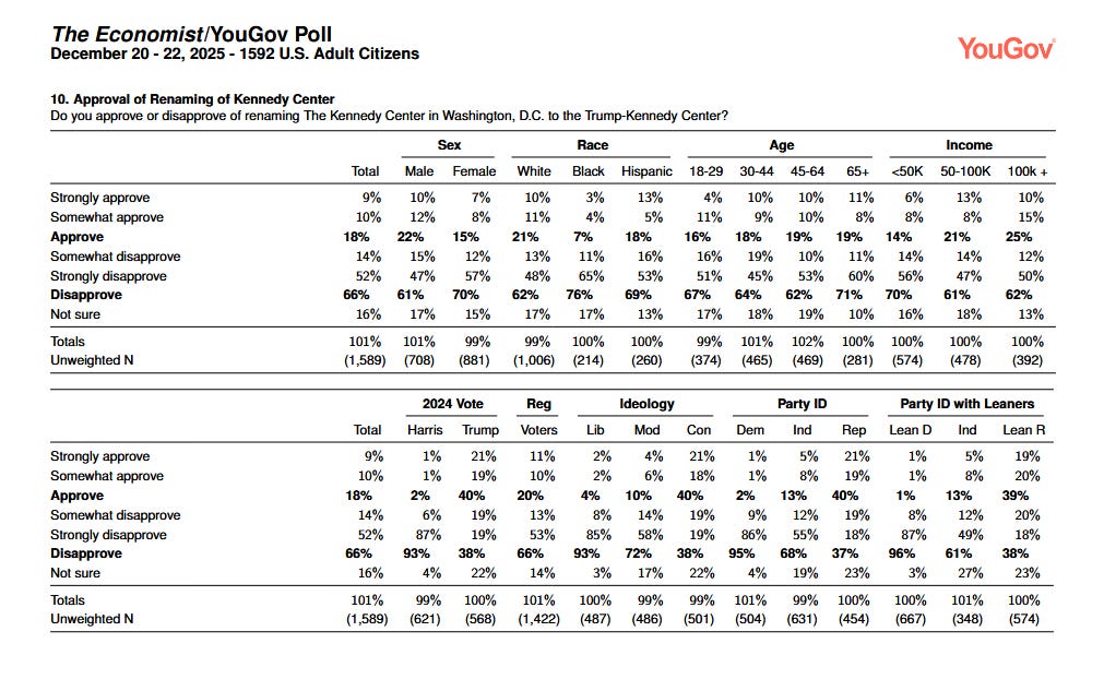 Note this remarkable nugget from the new Economist/YouGov weekly track - approval of renaming the Kennedy center clocks in 18%-66% disapprove. It may be the single most unpopular thing he did this year.