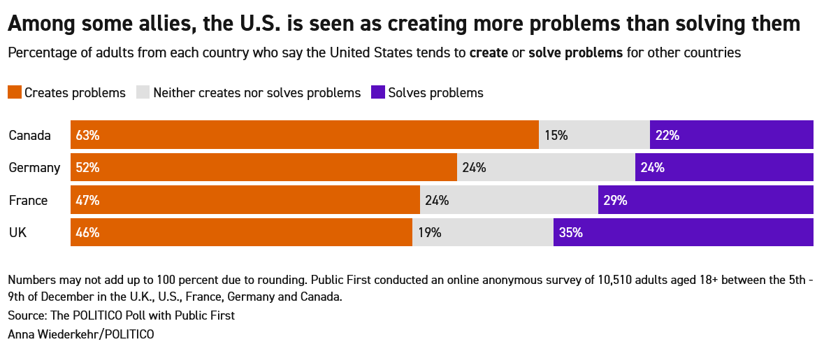 Pluralities in Germany and France — and a majority of Canadians — say the U.S. is a negative force globally, according to new international POLITICO-Public First polling. Views are more mixed in the United Kingdom, but more than a third of respondents there share that dim assessment.