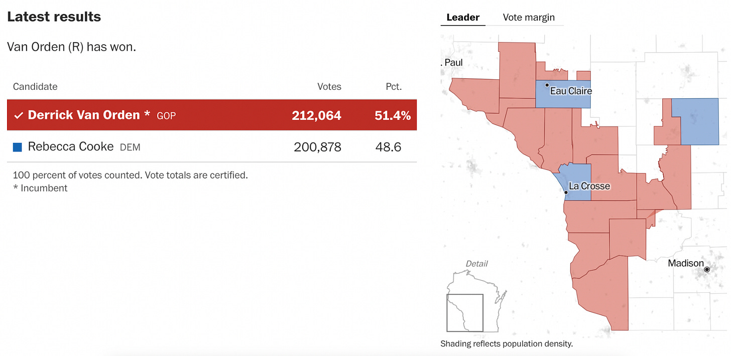 In 2024 Cook outperformed Harris in the district, losing by a little less than 3 points in a district Trump won by more than 7 points (Downballot). With the electorate shifting towards us this cycle, it puts Rebecca Cooke in a strong position to flip WI-03 this year.
