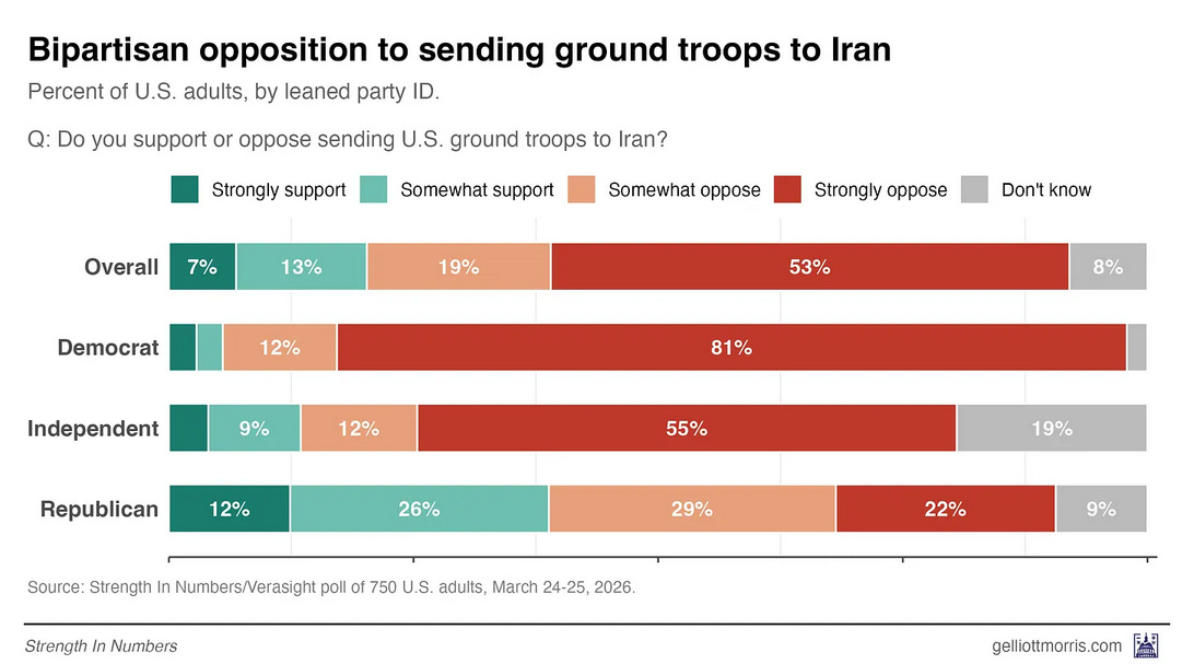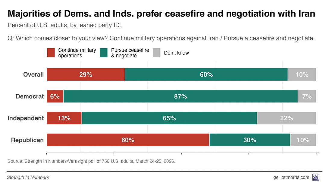 Iran: 72% oppose sending ground troops into the conflict. 60% prefer the U.S. pursue a ceasefire and negotiate with Iran, vs 29% who want to continue military operations.