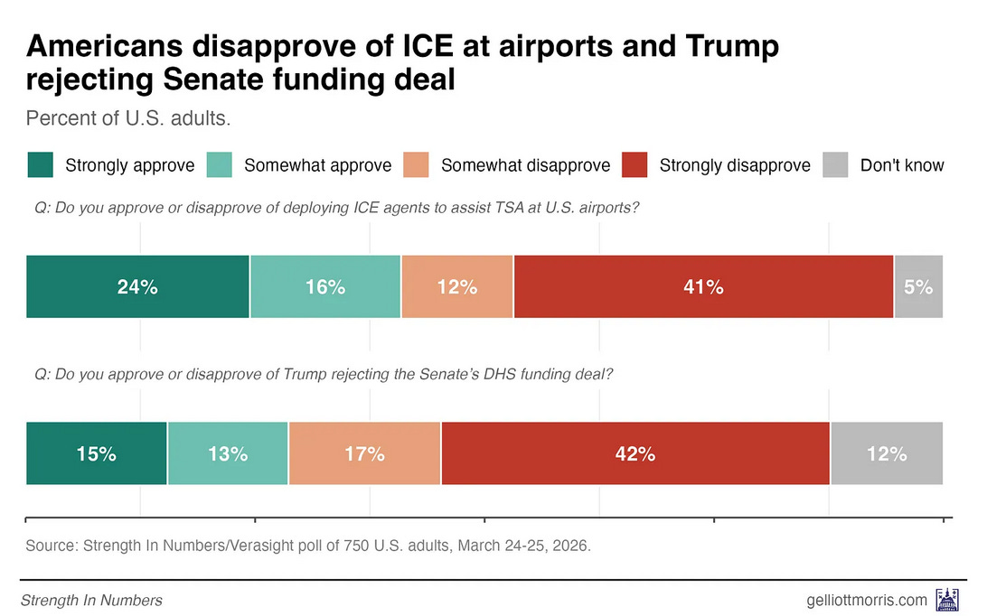 The Trump administration is fighting public opinion on two fronts this week. First, our new poll finds a majority of adults blame the president and Senate Republicans for the current chaos at U.S. airports, and Americans oppose sending Immigration and Customs Enforcement agents to help the Transportation Security Administration. Voters also disapprove of the president publicly refusing an offer from Senate Republicans to fund the non-ICE agencies in the Department of Homeland Security, including the TSA.