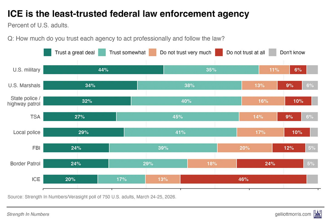 ICE trust: Only 37% trust ICE to act professionally — the lowest of any agency we tested.
