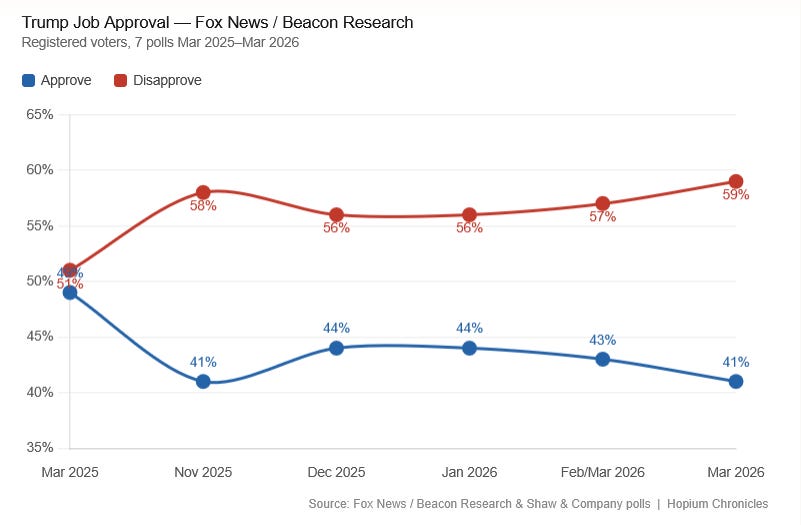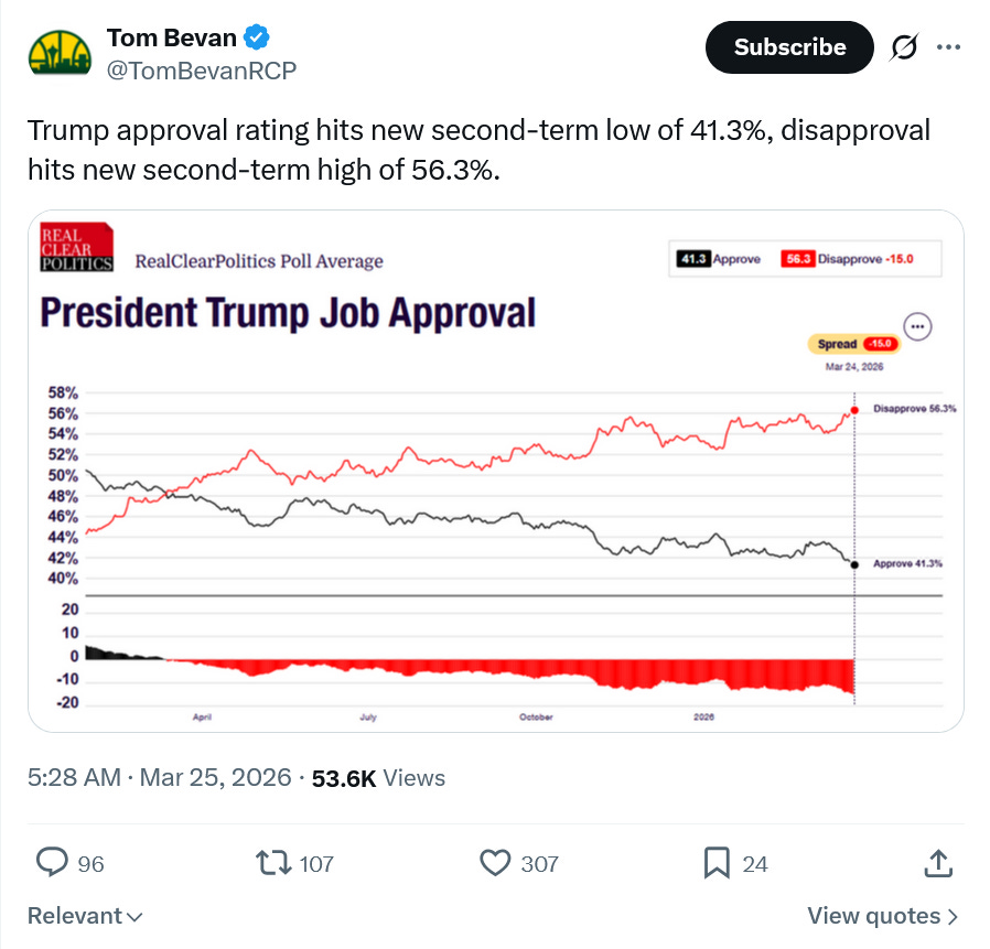 The national rejection and repudiation of Trump’s rancid regime has been profound, and deeply encouraging. While polls in the early days of the war did not move very much this week we’ve started to see movement against him, and in most polls he is now at the lowest place of his second term.