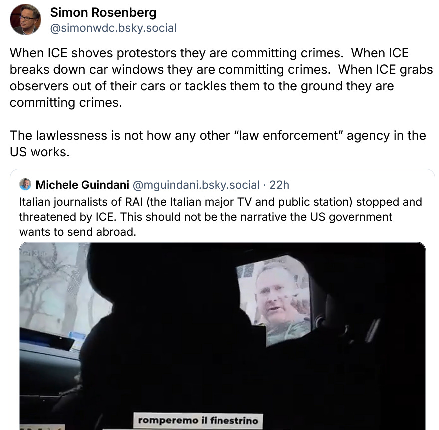 What's happening on the ground with ICE is is that they are acting completely outside of the law in any way. When they break a window of a car, that's illegal. When they push a woman to the ground, that's illegal. They are acting as if they have absolute immunity and impunity to do whatever they want. Now, why would they believe that? Because they were told by JD Vance and by the administration that they had absolute immunity and impunity. Vance went to Minnesota last week, right before the second killing… the second murder… to defend ICE and what they were doing in Minnesota. So the blood… I think that part of Jen, just strategically, what we really have to focus on now… if you're the guys in elections in 2026 in the Republican Party… the people that are causing this are Vance and Miller. Kristi Noem is just an operator in this whole thing. This is a Vance-Miller play. We gotta tie this to JD Vance. We gotta tie this to Stephen Miller. This is both of their strategies and, you know, they are bringing ruin to the Republican Party. It is amazing that Trump had one of his greatest humiliations of his presidency last week in Europe, where he looked like a bumbling fool to the world, and was humiliated and humiliated himself for his performance… he's about to go through a second process here. And it's why the pro-democracy forces in the United States have an obligation and a responsibility to prosecute this at the most aggressive possible level because they're weak and we need to seize the opportunity in front of us here.