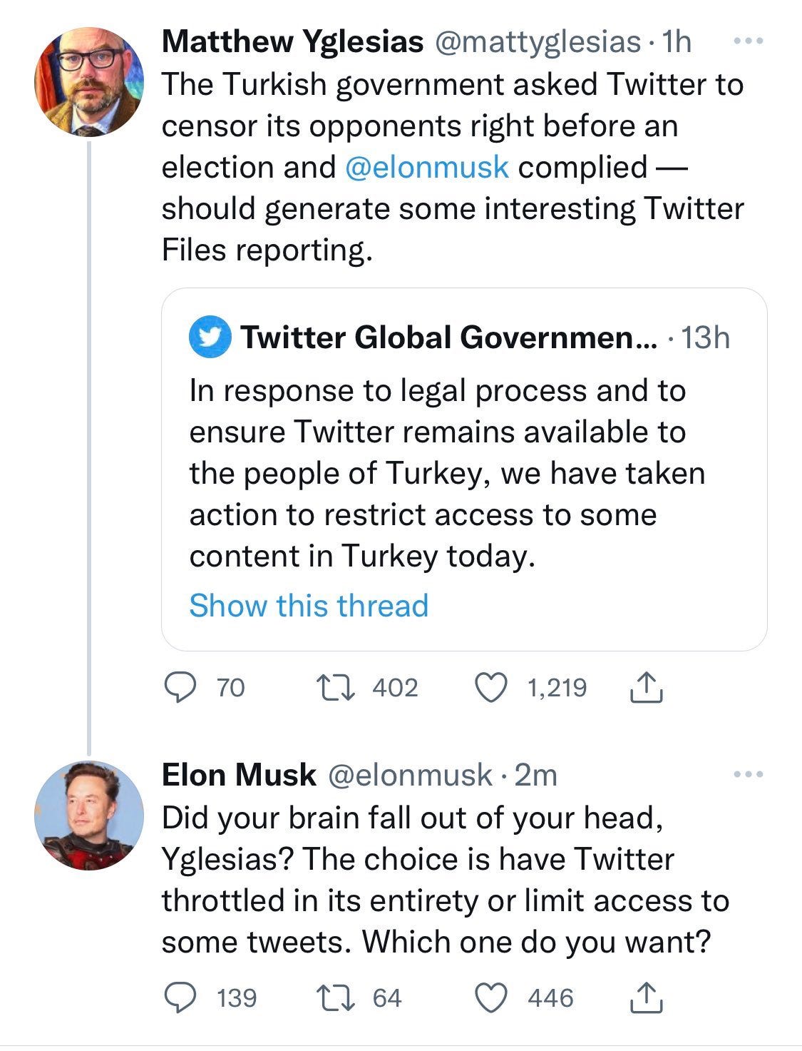 This weekend we saw why these efforts matter so much. The new Twitter, under the threat of action by the autocratic Turkish regime (whom Musk’s SpaceX is in business with), throttled or turned off pro-democracy opposition accounts for the final two days of the election. This precedent - caving to an autocratic government and turning off opposition voices without notice, due process or any transparency - is an ominous one for the world. For it means it gives Musk the power to intercede in any election at any time, including our own here next year.