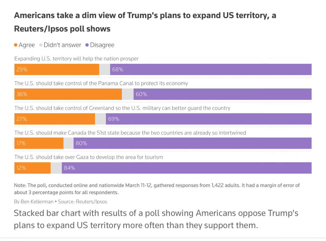 The two-day poll completed on Wednesday also found little appetite among Americans for Trump's expansionist agenda, as the Republican president talks of acquiring Greenland, Canada and the Panama Canal.