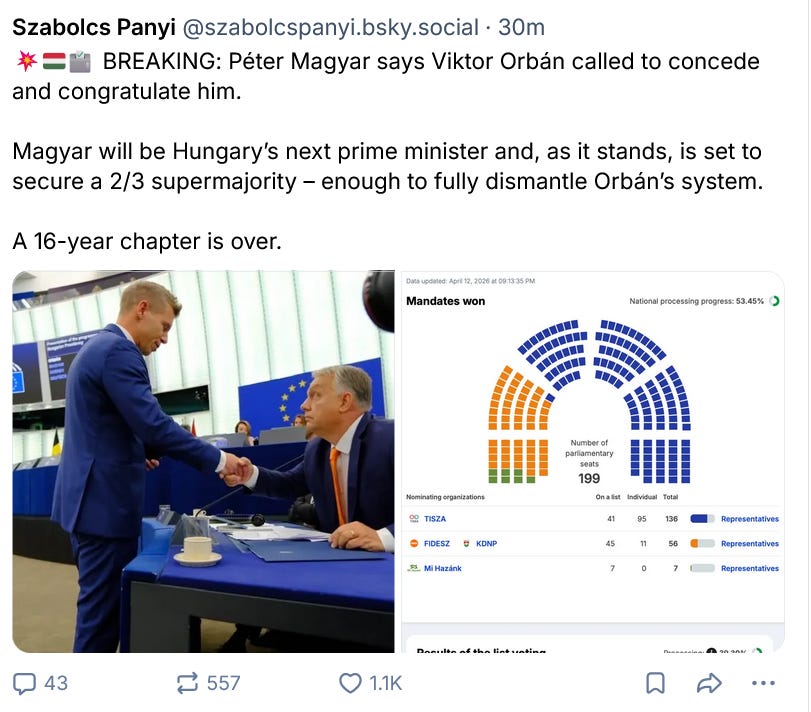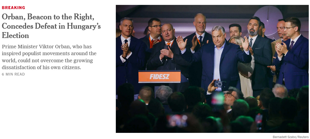 Greetings all. Victor Orban has lost in Hungary, and conceded: