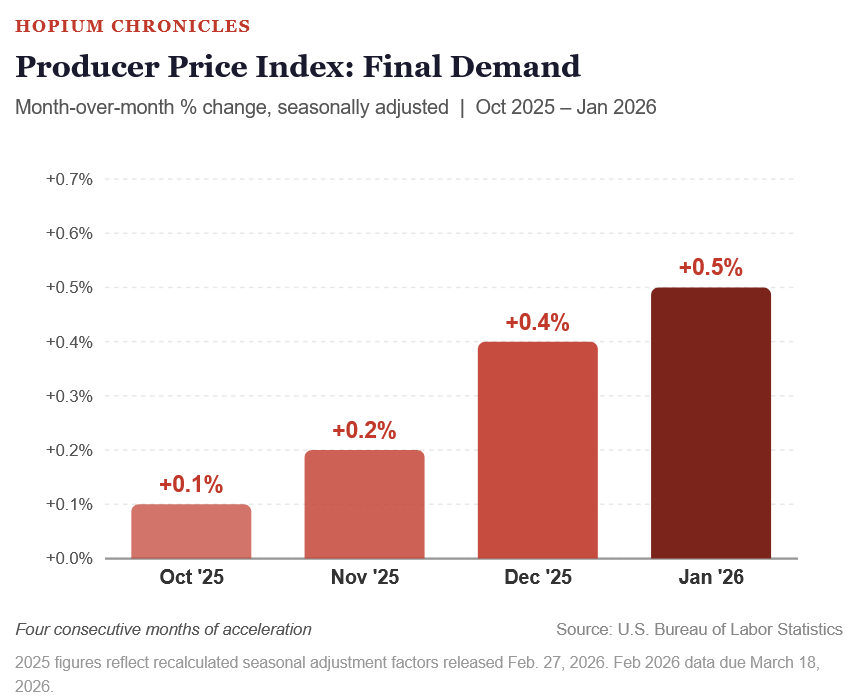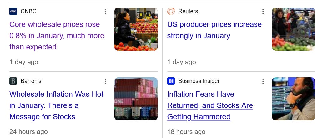 Morning all. Before we get to our new war, let’s review the new, terrible inflation data we got yesterday. One of the three main gauges of inflation, the Producer Price Index, rose 0.5% in January, much higher than expected.