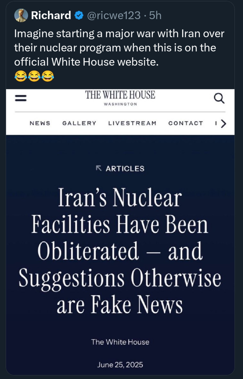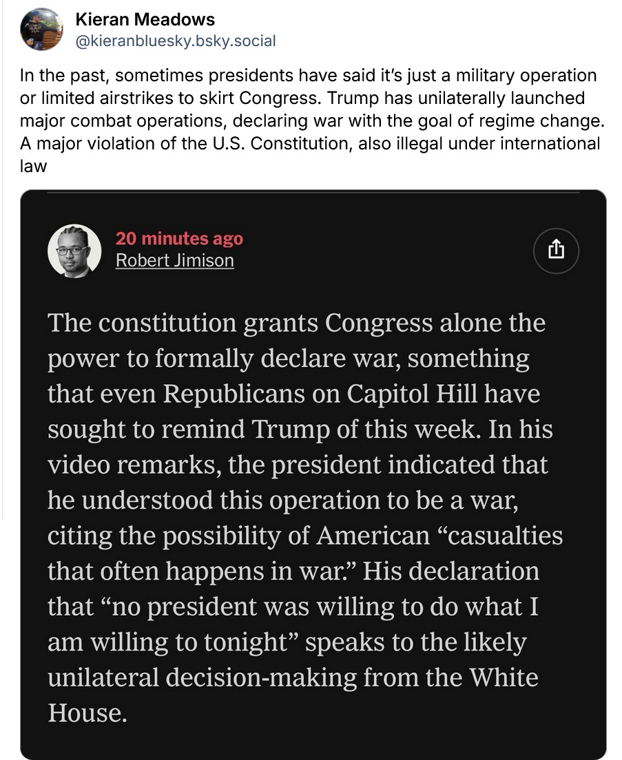 What is there to say, really? More full blown Mad Kingism. No clear rationale, no consultation or approval from Congress, no discussion with the American people, no Coalition of the Willing (meaning no allies). Like with the tariffs, there is no version of what Trump is doing in Iran that can be considered faithful to the Constitution, US Law, or International Law. As Gov. Newsom says, just “the law of Don.”
