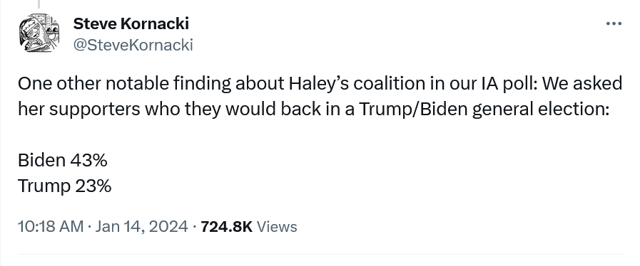 In my talk last night I offered this bottom line take - the post-Dobbs dynamic of Dem overperformance/Republican struggle is showing up now in early 2024 as it did in 2022 and 2023. Turnout in Iowa was way below expectations and Trump only won 56,000 votes from the almost 750,000 registered Republicans in the state. Trump ran 10 points below pre-election polling in New Hampshire, and about half of those who voted in IA/NH voted against him. In both states entrance/exit polling found more than 30% of Republican voters having really serious problems with Trump if he’s convicted of a crime, and in Iowa more Haley voters said they would vote for Biden than Trump in the general election. It’s a willingness to cross over and support the other party I am not sure we’ve seen in the last 40-50 years of Presidential polling.