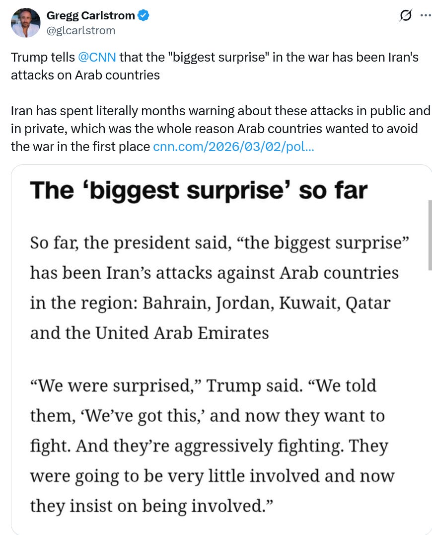 Rather than summarizing his remarks I am rushing this interview out and encourage you to watch and share with others. The recording and transcript are above. Rep. Smith does confirm what we discussed this morning, and what are seeing with our own eyes - there is immense confusion about the strategy and mission, things are escalating in ways they did not count on, and yes there is no possible legal justification for this war that Trump promised, repeatedly, again and again, would never ever happen.