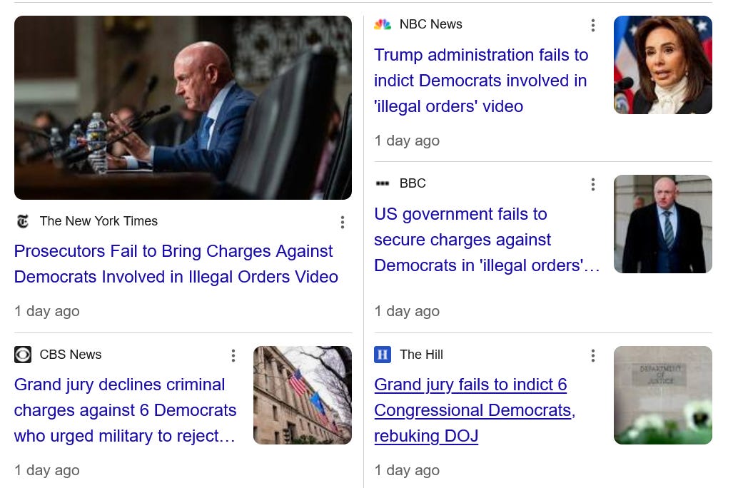 We learned this week that the Trump regime had tried to indict all six - 2 Senators and 4 House Members - for a variety of crimes, but thankfully a grand jury failed to return an indictment.