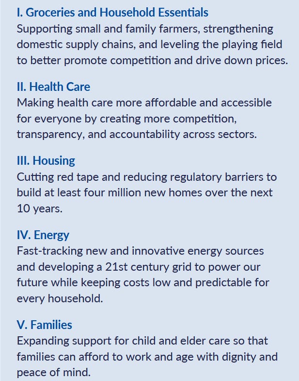 Yeah, and as you mentioned, there are the five pillars and they include things like groceries and household items. They are tariff related, but that's part of the groceries and household items area. It also has to do with housing, and housing affordability, where tariffs also are playing a pretty significant role in elevating the price of new housing as well. It includes healthcare and that's something that we saw it was so important to the American people — that the government shut down for the longest period in history over this issue. And so there's some good and sound suggestions on how to make health care more affordable and more accessible for more people and that's a big issue in all of our districts, I think.