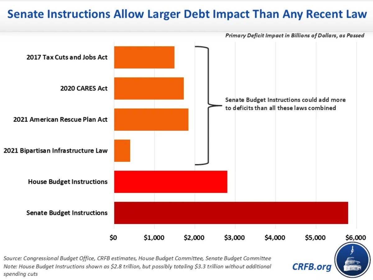 the proposed concurrent Fiscal Year (FY) 2025 budget resolution would allow policymakers to add $5.8 trillion to primary deficits through 2034 via a reconciliation package. Such a bill would be historically unprecedented in its fiscal irresponsibility, adding several times more debt than any reconciliation package or other recent piece of legislation.