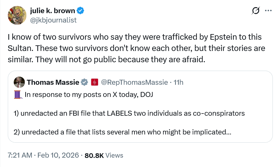 Here’s a new post from Julie Brown, the Miami Herald reporter responsible for putting Epstein’s crimes back in the public eye in 2018. Shit is getting real now: